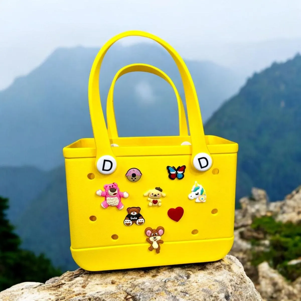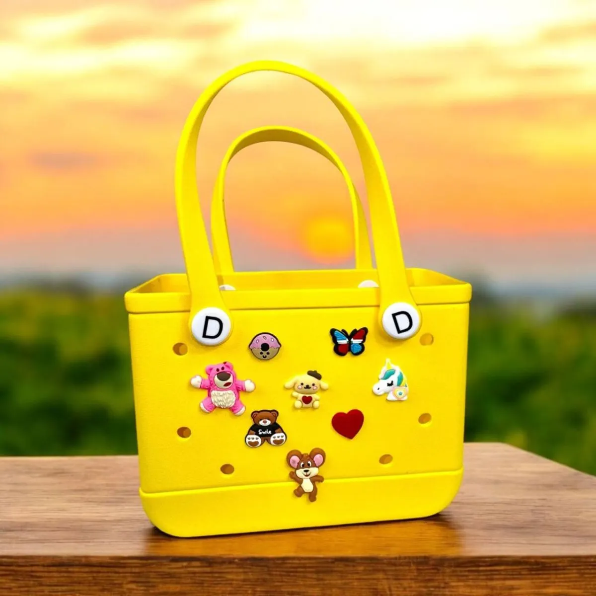 Bolsa EVA Pequena Amarela Tote Domun Com Adesivos é a escolha perfeita para quem busca praticidade, estilo e resistência no dia a dia.