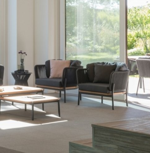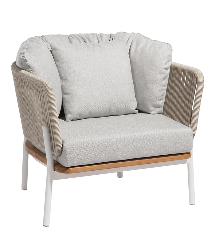 A poltrona Campania, com almofadas integradas, possui uma estrutura robusta em alumínio que garante durabilidade e fácil manutenção. A poltrona Campania para área externa está disponível em duas cores elegantes, capazes de se integrar harmoniosamente a qualquer ambiente — do clássico ao mais contemporâneo.