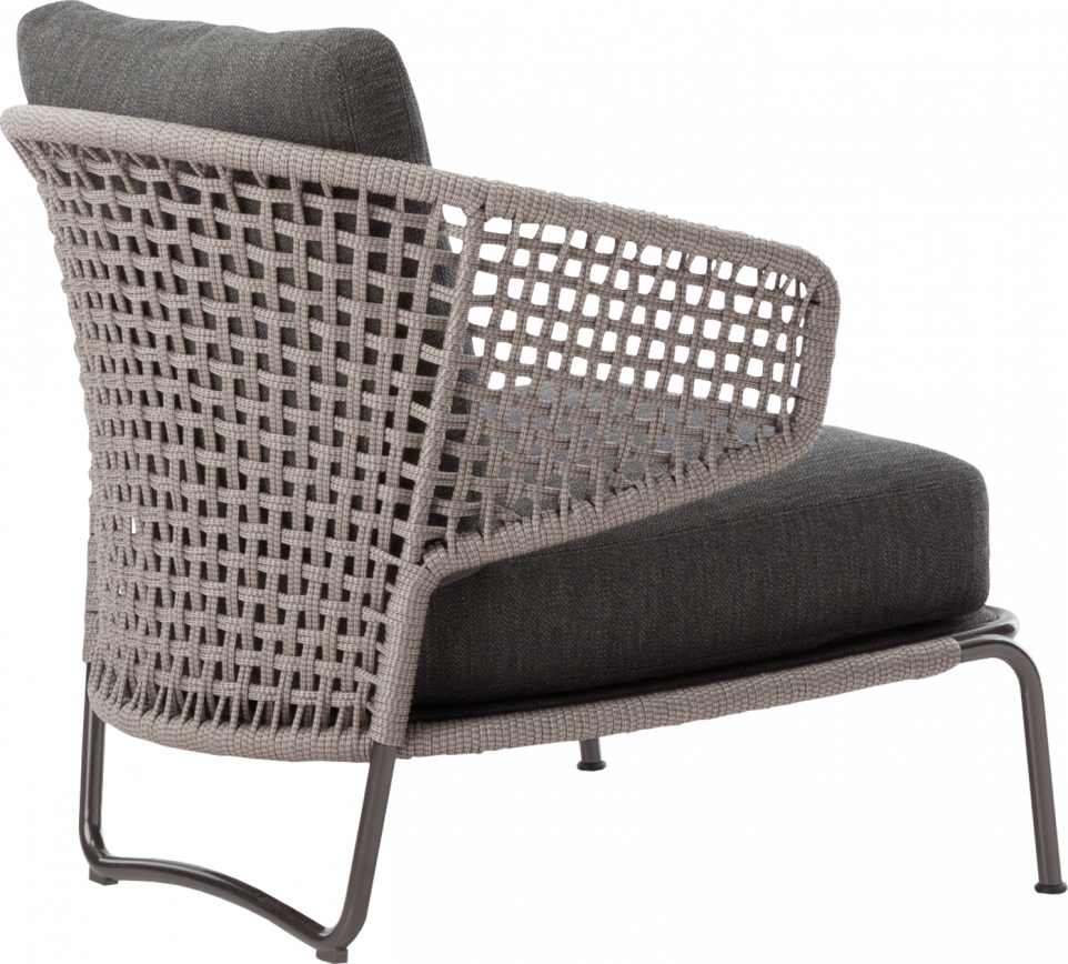 A Poltrona Lalaria apresenta uma leitura diferente do mesmo conceito por meio do uso de materiais distintos. A estrutura em metal pintado recebe acabamento na cor Pewter, enquanto o encosto é confeccionado em corda especial de polipropileno trançado, com 7 mm de diâmetro, disponível em duas variações de cor: cinza claro e marrom escuro.